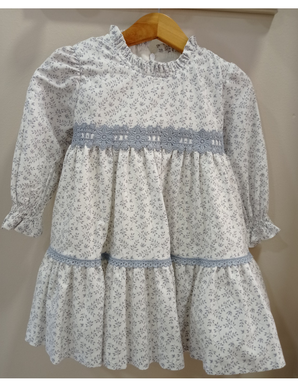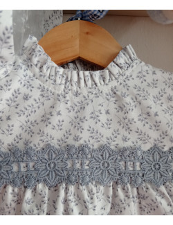 Vestido flores/gris, puño engomado y cuello con volante plisadito